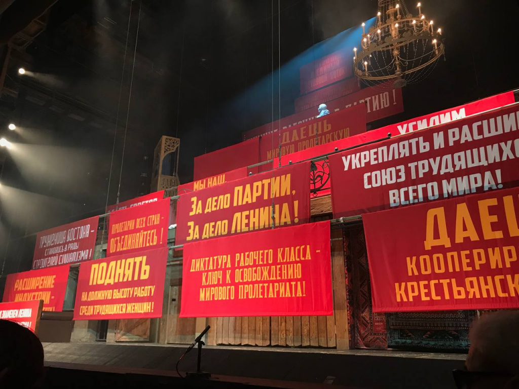 Перед спектаклем звучит трансляция ХIII съезда РКП(б). Это, конечно, инсценировка в исполнении актеров МХАТ имени Горького.