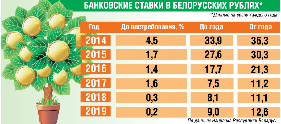 В России такой доходности по депозитам нет. Но ничто не мешает соседям по Союзному государству открыть вклад в Синеокой. Особенно это было выгодно несколько лет назад. Тогда белорусский рубль девальвировался, и никто не хотел хранить деньги в национальной валюте. Чтобы как-то исправить ситуацию, решили увеличить ставки по вкладам. Доходило аж до пятидесяти процентов годовых.