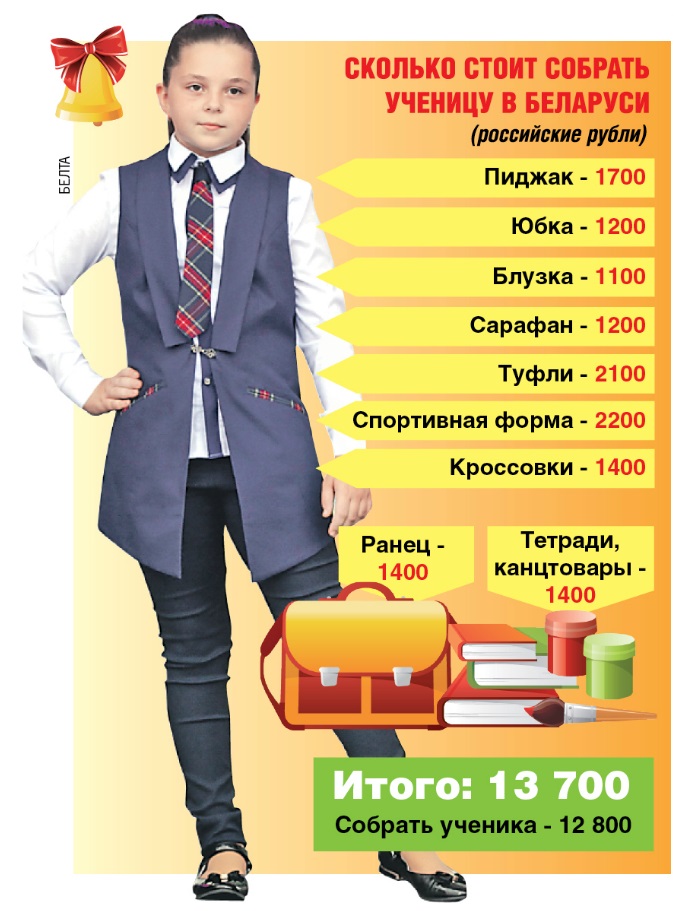 Минторг Беларуси считает, что для максимальной подготовки к школе ученика младших классов надо приготовить около 785 белорусских рублей (23,5 тысячи российских). Львиная доля расходов - чуть больше половины - приходится на одежду и обувь.