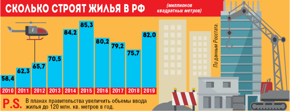 Сейчас объем строительства в России - 80 миллионов квадратных метров в год. Он почти не меняется в последние пять лет (см. графику). Но цель у правительства стоит амбициозная. К 2024 году объемы должны вырасти в полтора раза - до 120 миллионов квадратных метров в год. И здесь нужно либо увеличивать количество объектов, либо ускорять их возведение. Но ведь хочется, чтобы и качество не страдало на этих ударных стройках. Есть и другая сложность. В отрасли по-прежнему много бюрократии.