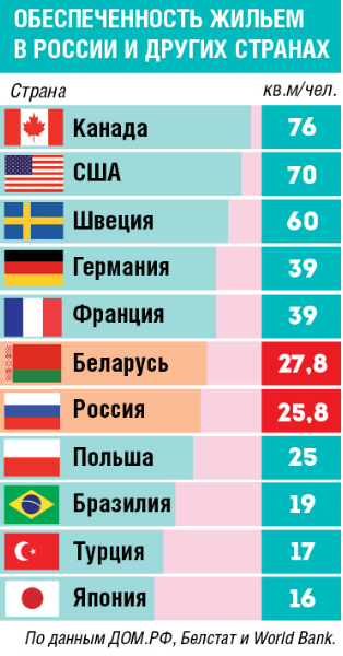 И хотя квадратные метры в России стоят относительно недорого (если сравнивать с другими странами), позволить себе россияне могут меньше. К примеру, у нас один квадратный метр стоит две средние зарплаты, во Франции - чуть больше половины, а в Америке - всего треть.