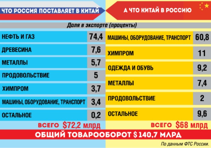 Мы в основном поставляем в Поднебесную природные ресурсы, которых там катастрофически не хватает. А Китай, в последние годы ставший одним из глобальных технологических лидеров, снабжает нашу страну техникой и оборудованием. Как считают эксперты, перспективы расширения сотрудничества между Россией и Китаем большие. Формула при этом проста: «ресурсы в обмен на технологические товары».