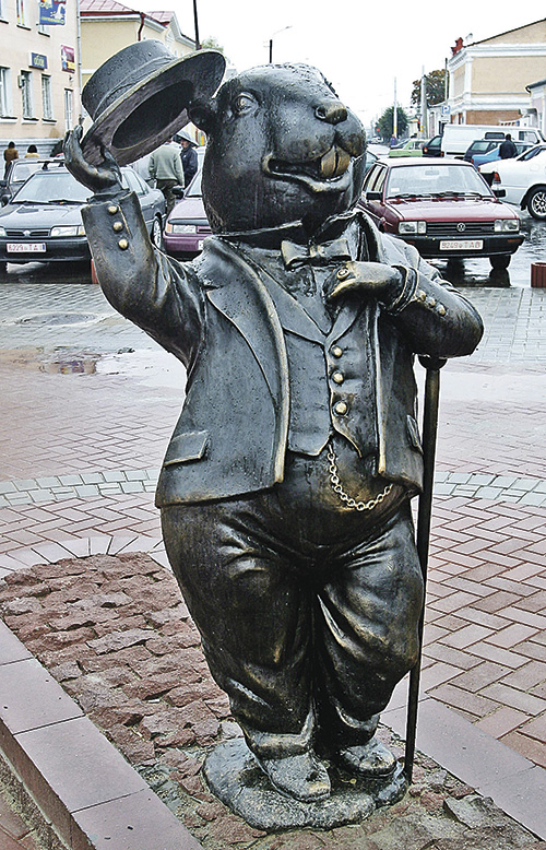 На улице Социалистической - местном Арбате - стоит памятник неофициальному символу города. У бронзового зверя есть имя, отчество и фамилия - Бобр Самуилович Бобруйский. Роста среднего, 1,70 метра, в сюртуке, с галстуком-бабочкой и в шляпе. В руке - трость, на пальце - перстень. В общем, среднестатистический бобруйчанин начала прошлого века.