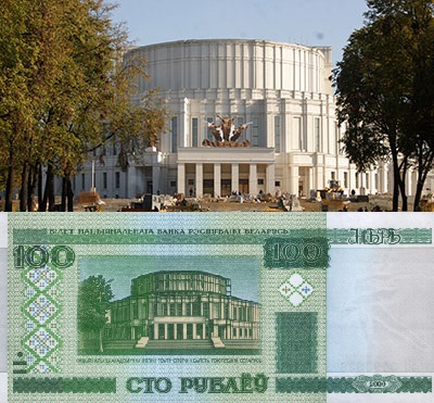 До деноминации в Беларуси самой мелкой купюрой было 100 рублей (в новых дензнаках – 1 копейка). На купюре изображен Национальный академический Большой театр оперы и балета. От станции метро «Немига» до театра неспешным шагом минут пятнадцать. Здание построено в 1938 году и не раз реставрировалось. После недавнего капремонта оно встречает гостей во всем блеске своего великолепия. Театр и парковую зону с фонтанами спроектировал известный архитектор Иосиф Лангбард. Он же является автором нескольких других важных зданий в Минске – Дома правительства, Дома офицеров, Академии наук. Последняя, к слову, была изображена на купюре в один рубль, которую изъяли из обращения в 2003 году. Все эти здания пережили Великую Отечественную войну – одни из немногих в полностью разбомбленном Минске.