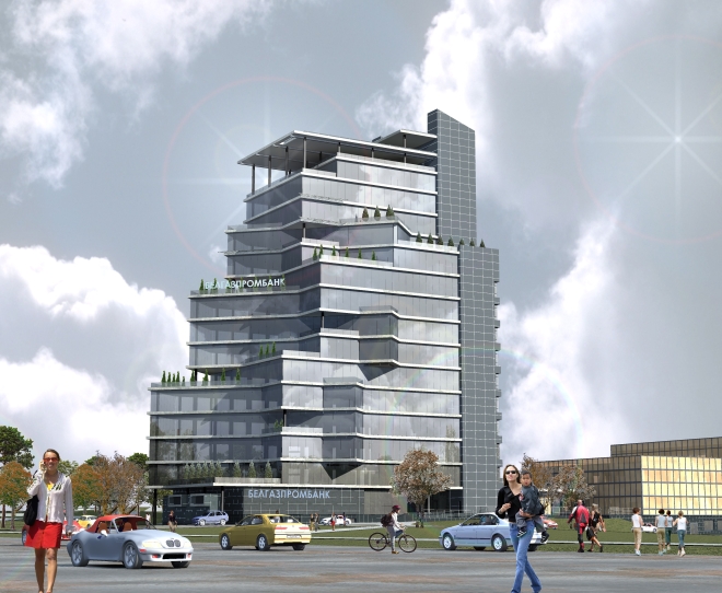 Головной офис «Белгазпромбанка» на улице Притыцкого напоминает архитектурную головоломку. «Ломаная» 15-этажная пирамида практически полностью застеклена и имеет открытые террасы, на которых растут вечнозеленые деревья – туи, кипарисы и можжевельники. Получается, с южной стороны – своеобразная «консоль» для переговоров, с западной стороны – «консоль» для отдыха. На верхнем этаже – обзорная площадка с видом на город. За счет такой архитектурной игры здание издалека выглядит динамично и неординарно.