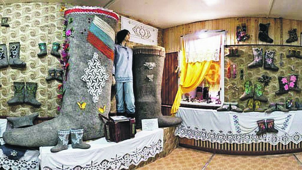 Есть тут и особенные экспонаты, занесенные в Книгу рекордов России. Самые маленькие валенки в мире даже Золушке бы не налезли. Они рассчитаны на ножку всего в шесть миллиметров. И уж тем более кажутся микроскопическими рядом с гигантской двухметровой парой.
