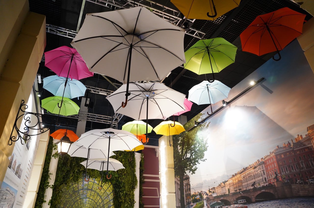 Кстати, о котиках - для любителей целый зал портретов мохнатых физиономий разных эпох. Потому что Питер - это и котики тоже. Они такой же неотъемлемый атрибут города, как его переменчивая, непредсказуемая погода. На выставке есть шуточный аттракцион - можно встать особым образом под зонтики, закрепленные на потолке, и на вас с виртуального неба прольется виртуальный дождик. Который вы в любой момент можете прекратить. Эх, вот так бы в реальности!