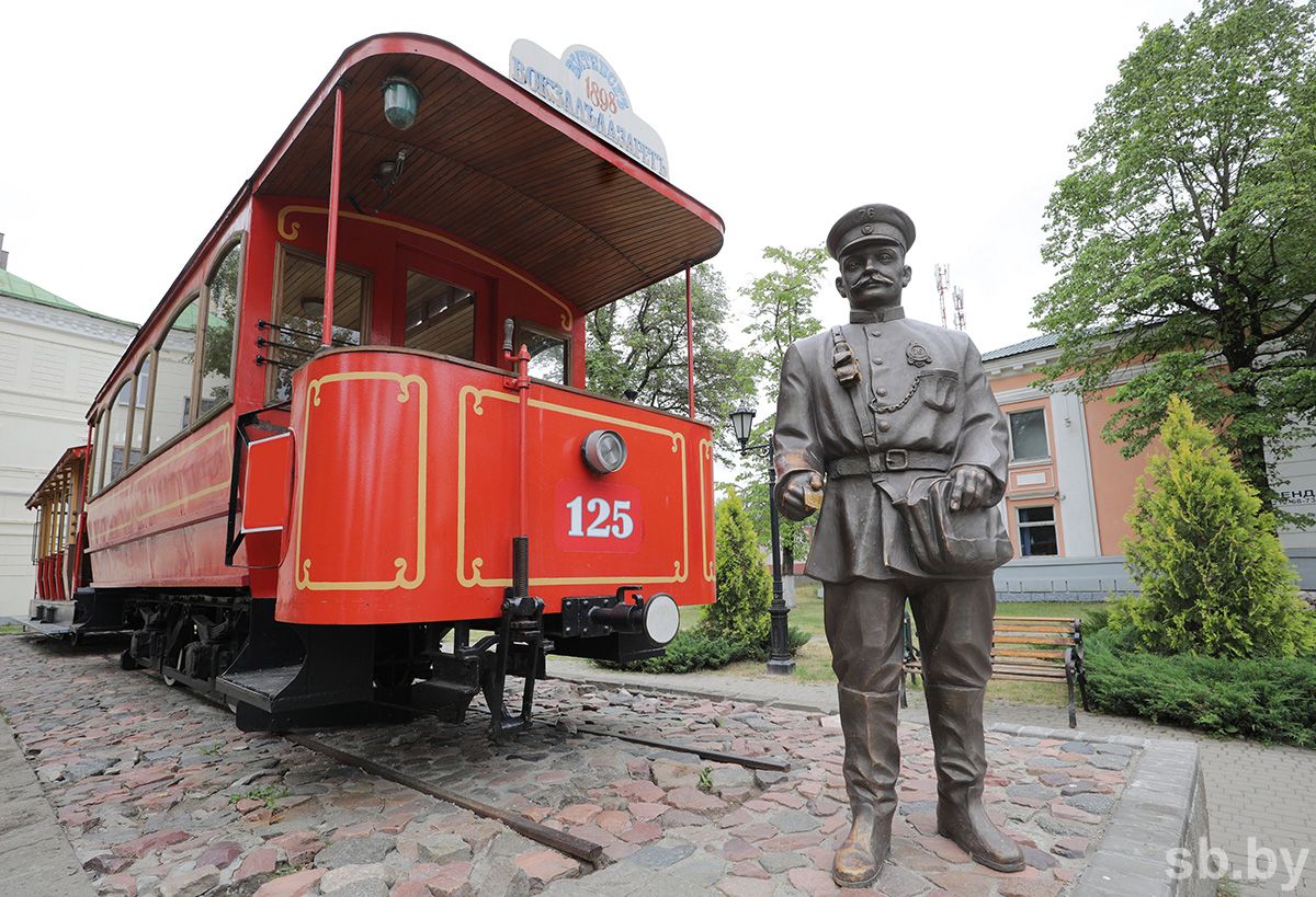 Гостей встречает и старинный колоритный вагон, который был установлен на пьедестал к 110-летию трамвайного движения в городе на Двине. Уникальный экспонат — рельс немецкой фирмы «Бохум», выпущенный в 1898 году. Именно такие лежали изначально в Витебске. Тогда в городе было чуть более 5 километров путей. Трамваи ходили по четырем маршрутам с 7 утра до 9 вечера. Водитель, которого называли «ватман» («электрический мужчина»), работал в одну смену. Правда, мог отлучиться на продолжительный 3–часовой обед.