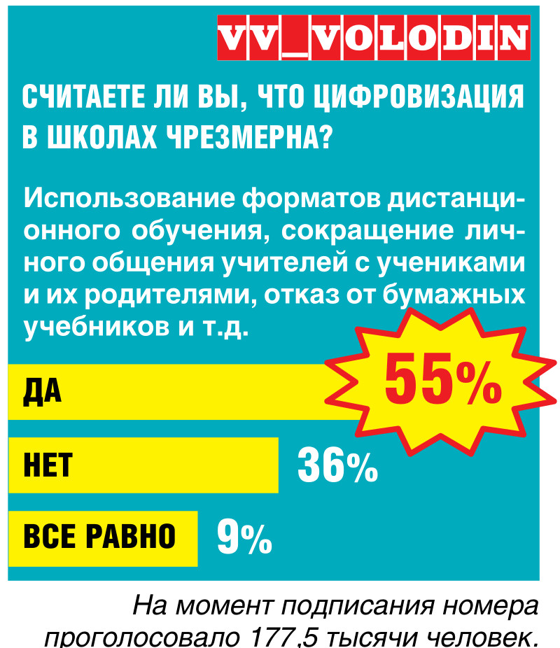 - Пандемия прошла, а цифровые средства коммуникации, которые использовались в ходе пандемии - тогда обоснованно, не отменены. Дальше будет продолжаться или мы все-таки найдем в себе силы, остановимся, признаем ошибки и сделаем все для того, чтобы был постоянный диалог - и возможность для этого была создана - учителя с родителем, учителя с ребенком? Люди категорически возражают против того, что им навязывают.