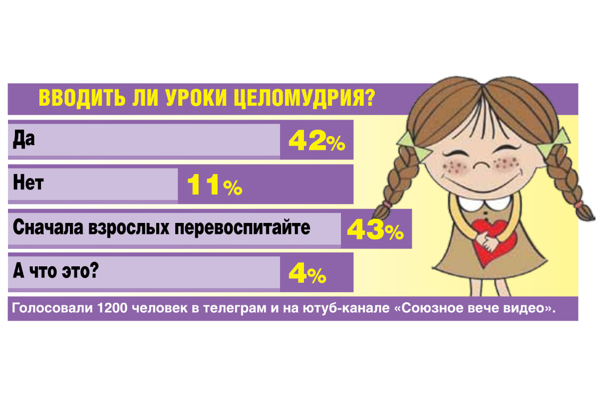 Как видите, сорок два процента респондентов согласны с предложением Николая Бурляева. И почти столько же — сорок три процента — считают, что целомудрию надо и взрослых поучить.