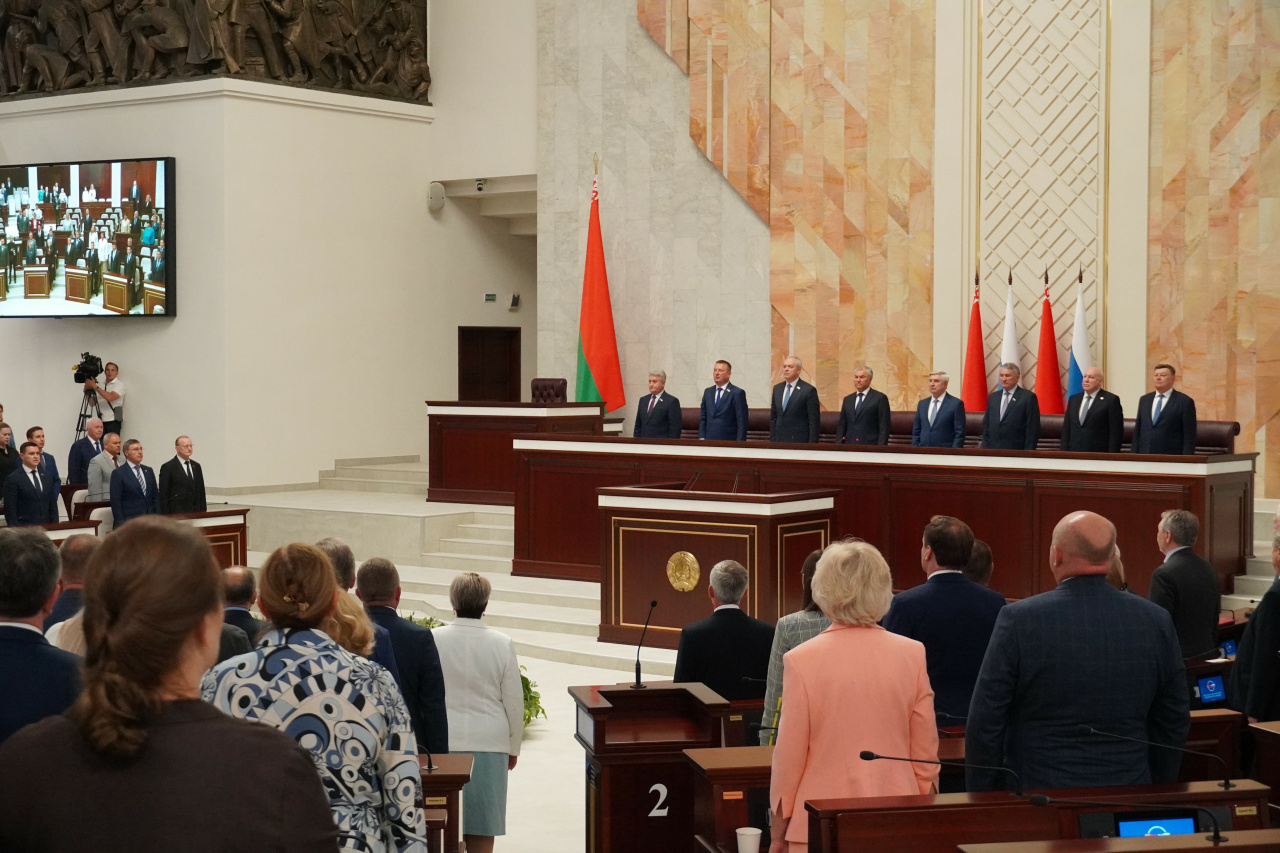- Демократия — это процедуры, нормы и правила! - говорит глава российской делегации, Председатель Парламентского Собрания Вячеслав Володин, предлагая начать с демократической процедуры: проверить кворум (депутатов — по 36 от каждой из двух стран, и почти все они сейчас в зале). Кворум есть — сессия открывается гимнами обоих государств.Сразу же — другие процедурные вопросы. Первым заместителем председателя Парламентского Собрания избирается Игорь Сергеенко. Это новый спикер Палаты Представителей (белорусский аналог нашей Думы — прим. ред.): в Синеокой в нынешнем феврале прошли парламентские выборы, состав депутатов почти полностью обновился.