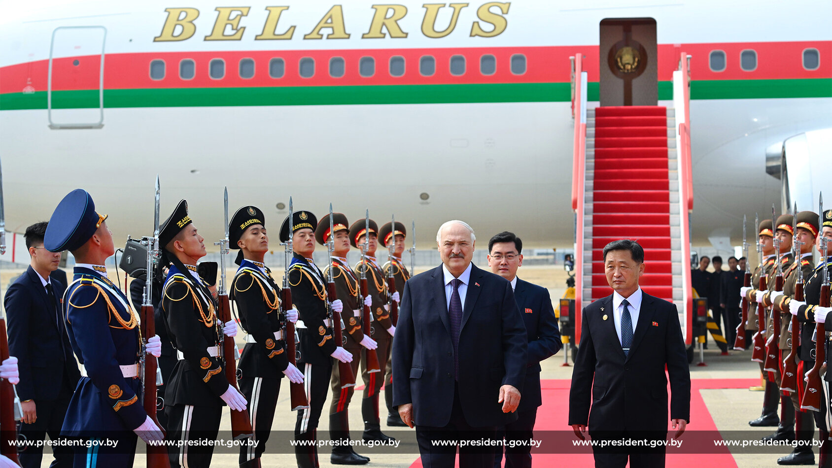 У трапа самолёта белорусского лидера встречали первый заместитель премьер-министра КНДР Ким Ток Хун и министр иностранных дел Беларуси Максим Рыженков. По информации Telegram-канала «Пул Первого», церемония встречи прошла в торжественной атмосфере: красная дорожка, рота почётного караула, дети с флажками и традиционное вручение букета цветов. Кортеж президента сопровождал почётный эскорт из 21 мотоцикла.