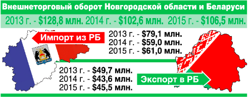 В этом году исполнится 15 лет, с тех пор как администрация области и правительство республики заключили Соглашение о торгово-экономическом, научно-техническом и культурном сотрудничестве. Руководство региона держит связь не только с правительством Беларуси, но и напрямую сотрудничает со всеми областями республики. Новгородцы поставляют соседям медь, древесину, бумагу, химическую и фармацевтическую продукцию, различное оборудование, стекло, мебель, оптику. Белорусы привозят им продукты питания, одежду, обувь, электрические машины, пластмассы, стройматериалы, спортинвентарь.