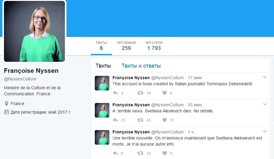 В твиттере Нильсен через полчаса после первой запили появился все объясняющий новый «твит»: это фейковый аккаунт, созданный итальянским журналистом Томмассо Дебенедетти.