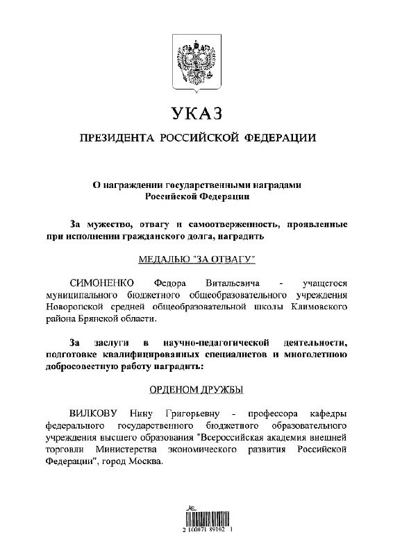 Президент России Владимир Путин наградил медалью «За отвагу» 10-летнего Федора Симоненко, который спас двух детей во время нападения украинских диверсантов в Брянской области. Указ опубликован на официальном портале правовой информации.