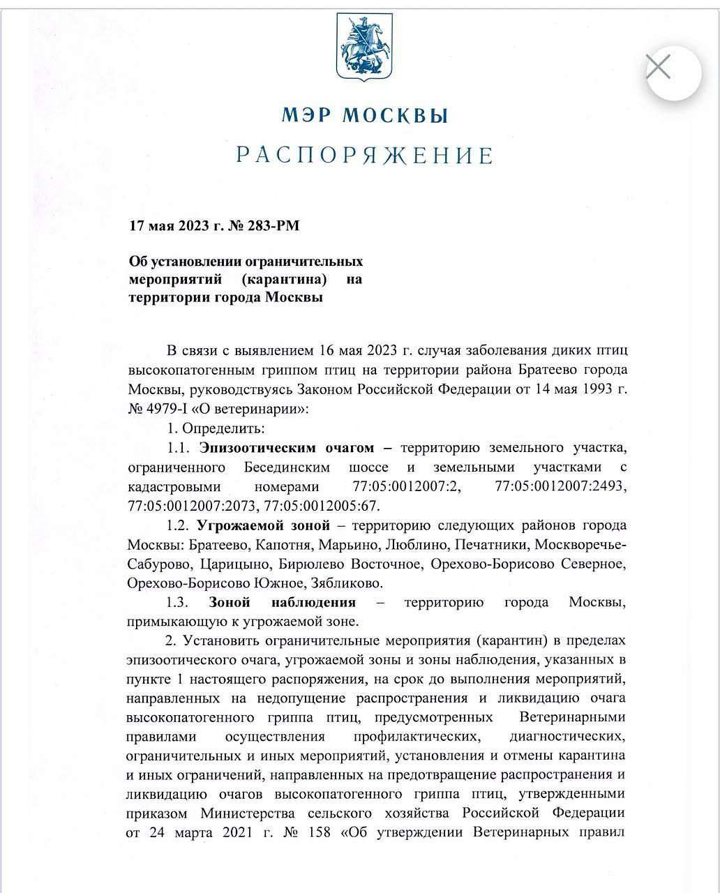Мэр Москвы Сергей Собянин объявил о введении карантина в нескольких районах столицы из-за птичьего гриппа. Документ опубликован на сайте мэра.