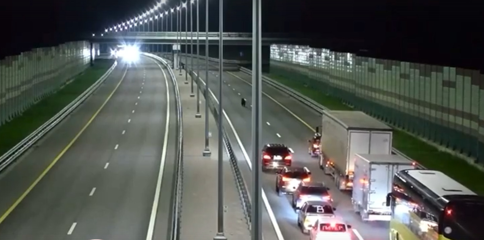 Отчаянный забег медвежонка зафиксировала видеокамера «Объединённых систем сбора платы» (ОССП) – оператора по взиманию денег за проезд.