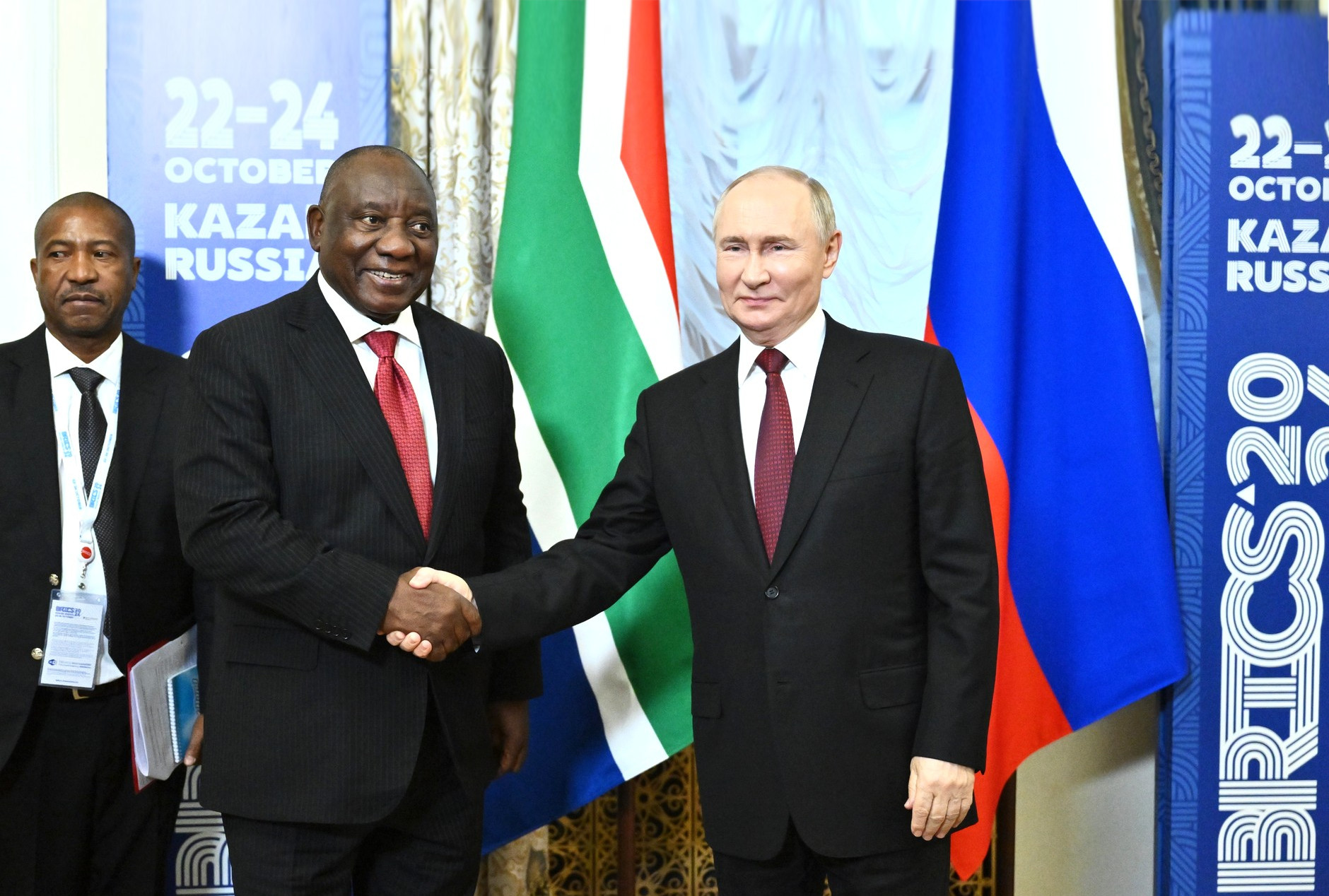 22 октября на полях саммита БРИКС в Казани Президент РФ Владимир Путин встретился с Президентом Южно-Африканской Республики (ЮАР) Сирилом Рамафозой.