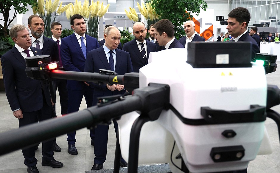 Владимир Путин посмотрел на участки разработки, сборки и испытаний беспилотных авиационных систем (БАС).