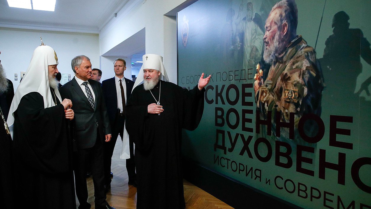 Председатель Государственной Думы, Председатель Парламентского Собрания Союза Беларуси и России Вячеслав Володин, Патриарх Московский и всея Руси Кирилл, главы фракций, депутаты Госдумы, а также представители духовенства ознакомились с работами экспозиций «Русское военное духовенство» и «Красота Божьего мира».