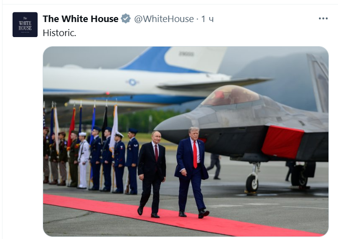 Встреча Президента Российской Федерации Владимира Путина и Президента США Дональда Трампа проходит на американской военной базе Эльмендорф-Ричардсон близ Анкориджа (штат Аляска, США).