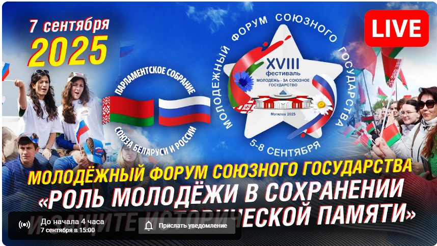 Сегодня, 7 сентября, в 15:00 в Могилеве пройдет Пленарное заседание Молодежного форума Союзного государства «Роль молодежи в сохранении и защите исторической памяти»