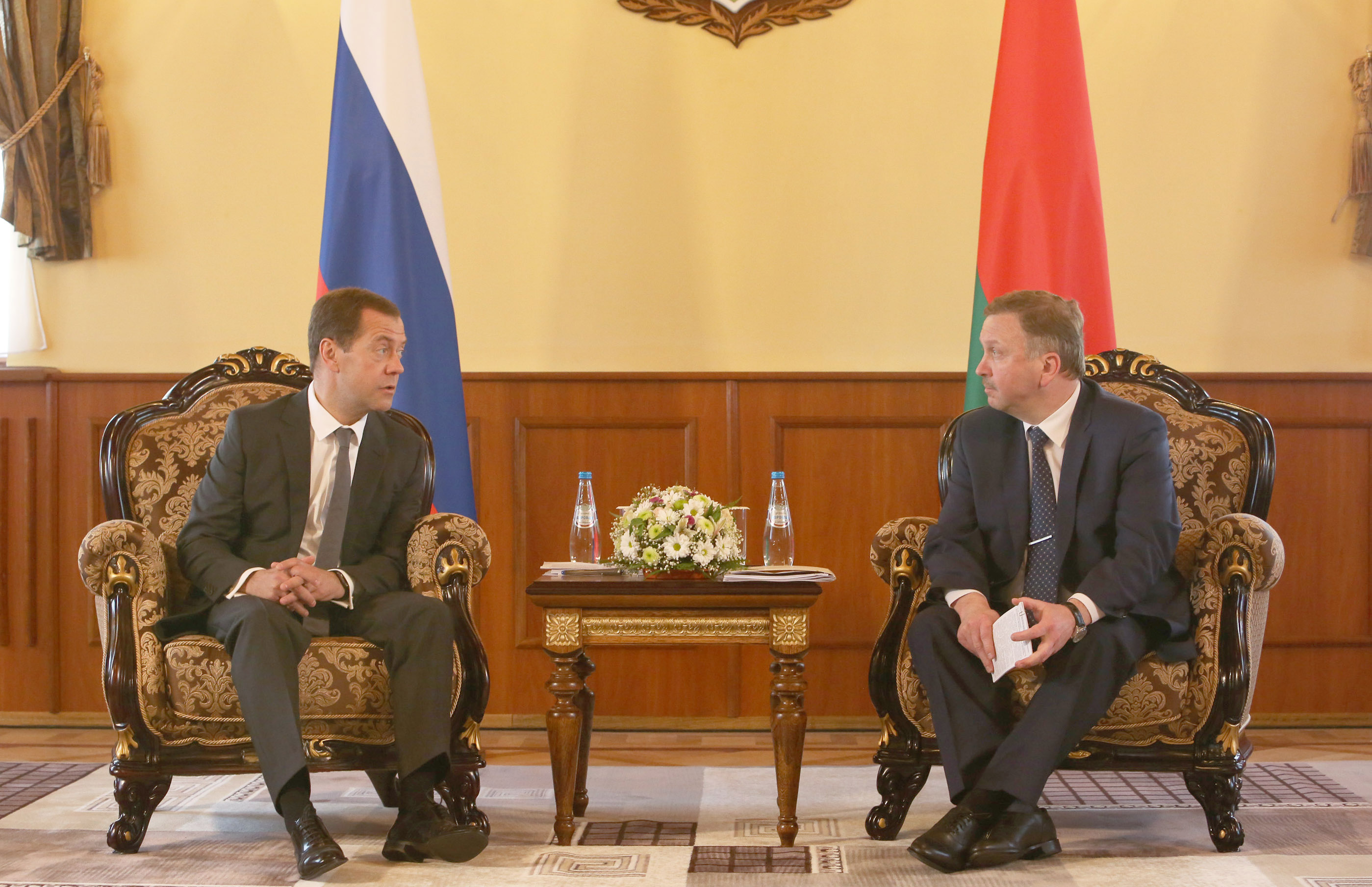12 мая, перед началом заседания союзного Совмина, Премьер-министр Беларуси встретился со своим российским коллегой Дмитрием Медведевым На снимке: Андрей Кобяков и Дмитрий Медведев....