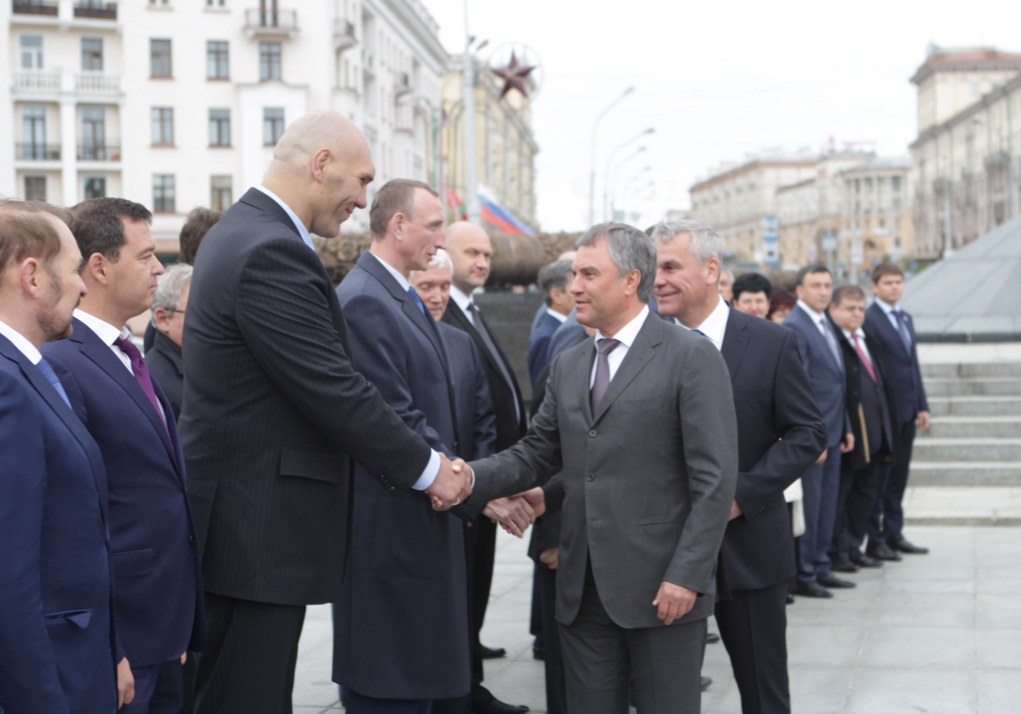 14 июня председатель Парламентского Собрания Союза Беларуси и России Вячеслав Володин и первый заместитель председателя ПС Владимир Андрейченко возложили венок к монументу Победы в Минске. На снимке: Николай Валуев, Вячеслав Володин, Владимир Андрейченко, союзные парламентарии.Фото Рамиля Насибулина, БЕЛТА. Делегация Федерального собрания Российской Федерации во главе со спикером Госдумы Вячеславом Володиным прибыла в Минск для участия в сессии Парламентского Собрания Союза Беларуси и России, сообщает...