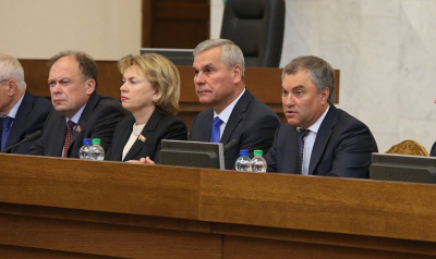 На сессии обсуждаются вопросы сближения законодательств Беларуси и России, ход реализации приоритетных направлений и первоочередных задач дальнейшего развития Союзного государства на среднесрочную перспективу На фото председатель Палаты представителей Национального собрания Беларуси Владимир Андрейченко и спикер Госдумы России Вячеслав Володин перед началом заседания. Источник: БЕЛТА